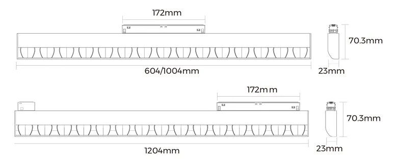 Description: Lite Unite DC Magnetic Wall Wash Linear is a versatile lighting solution designed for retail stores, art galleries, museums, supermarkets, offices, and institutions. Crafted from AL6063-T5 material with a spraying surface finish, it provides grazing wall wash illumination in lengths of 600mm, 1000mm, or 1200mm. Available in black (RAL9005) or white (RAL9003), it features wattages of 10W, 15W, or 20W with an impressive efficiency of 83LM/W. The fixture offers a beam angle of 60°x25°x75°, selectable CCT options of 2700K, 3000K, or 4000K, and a high CRI of 90 for true color rendering. It supports various dimming methods including non-dimming, DALI-2, Tuya Bluetooth, and CASAMBI, with input voltages of DC24-48V or DC48V. Certified for CE, UKCA, ROHS, and Reach standards, it ensures quality and safety in professional lighting applications.