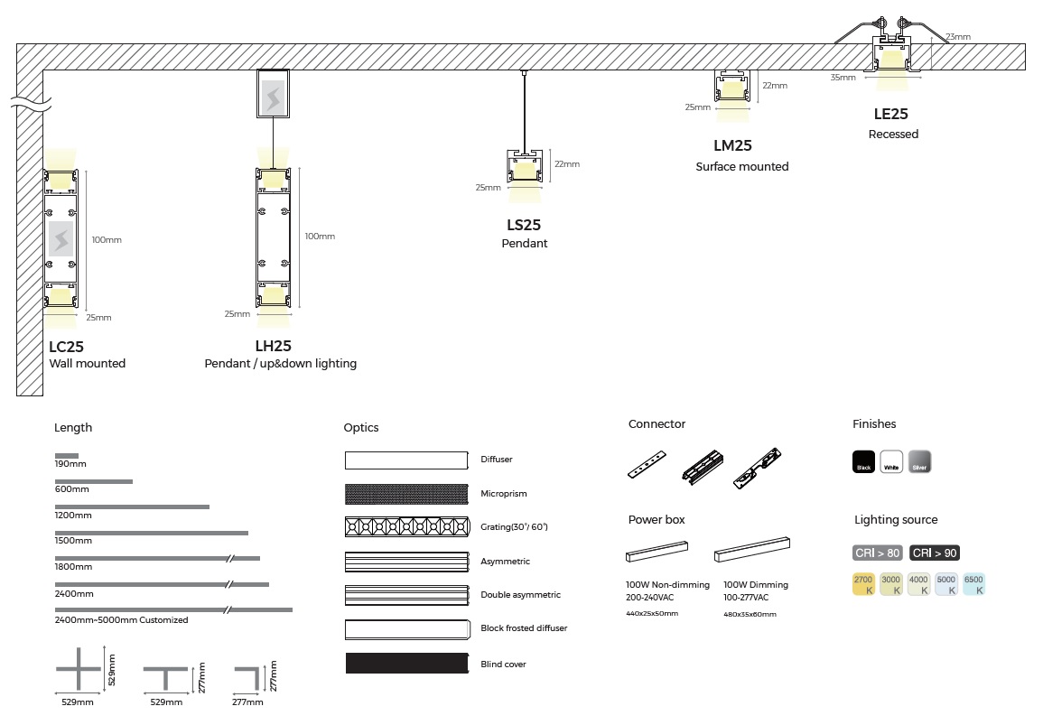 | LM 25 Ceiling | LM25 12w 600mm, LM25 24w 1200mm, LM25 30w 1500mm, LM25 36w 1800mm |