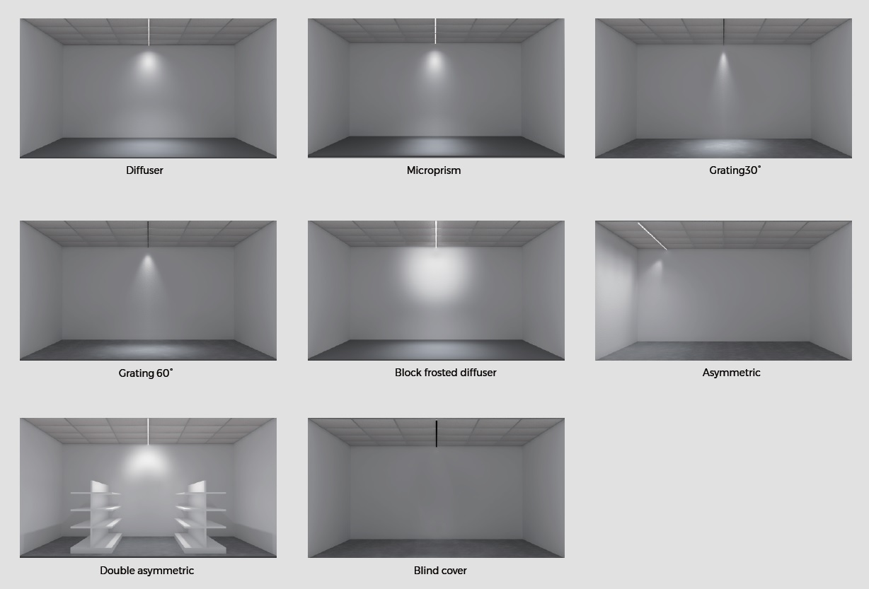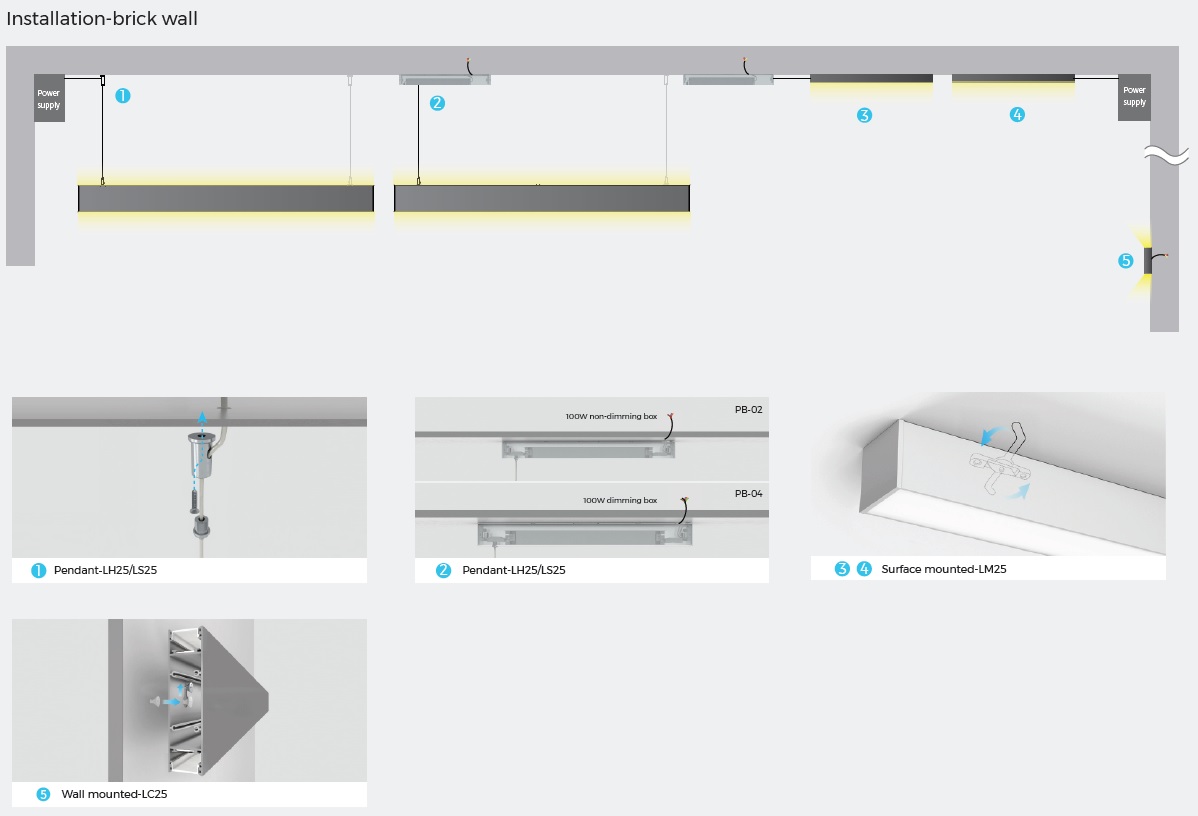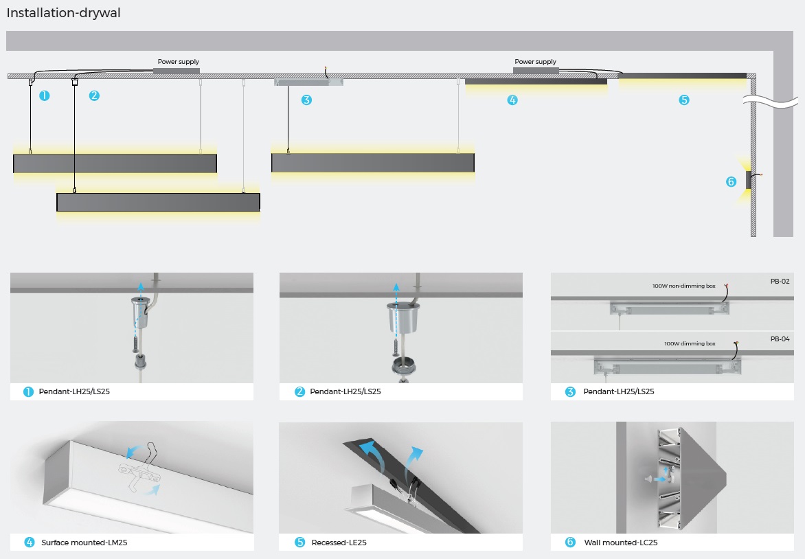 | LS 25 suspended | LS25 12w 600mm, LS25 24w 1200mm, LS25 30w 1500mm, LS25 36w 1800mm |