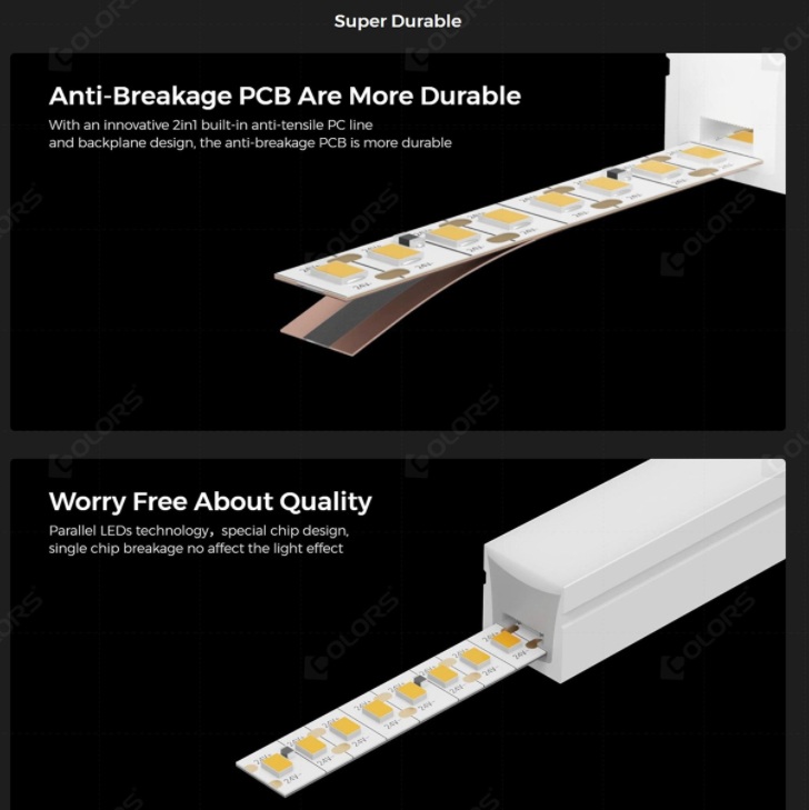Our Neon LED Strip is engineered for long-lasting performance and creative freedom. Designed with free-cutting capability, it allows you to customize lengths easily to match any project requirement. Built with UV-resistant materials, the strip maintains its clean, vibrant appearance without yellowing over time, making it ideal for both indoor and outdoor applications. The advanced anti-breakage PCB ensures durability and stability, while the anti-dead chip design guarantees seamless illumination with no dark spots. Featuring dual-chip parallel LED technology, even if a single chip fails, the overall lighting effect remains unaffected – delivering consistent brightness and reliability.