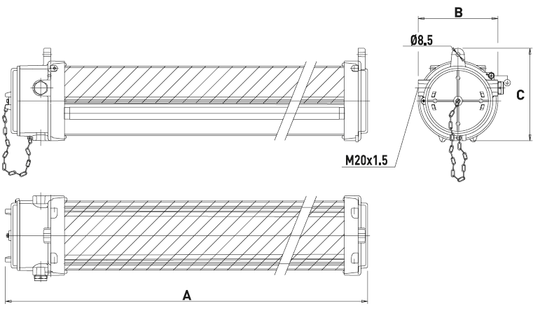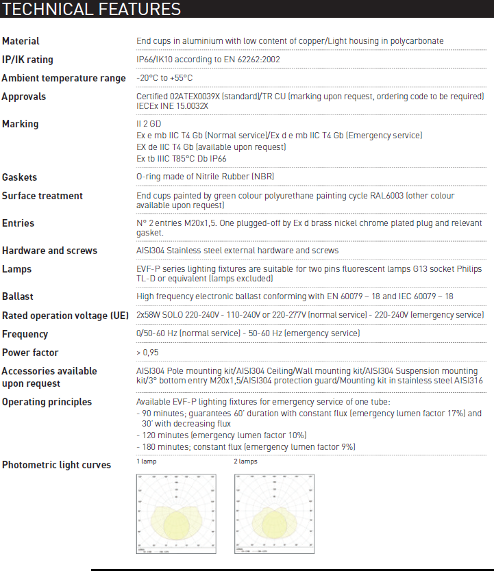 EVF-P lighting fi xtures are manufactured with an high resistance cylindrical polycarbonate lamp housing and with end cups made of corrosion resistant copper free aluminium. Polycarbonate lamp housing is a three layers-extrusion UV resistant able to grant the best protection against sun rays and related yellowing effect. Circular shape grants the best possible “CX” factor, therefore it is less affected by winddusts, no fl at surfaces to avoid pollution and dirty bunching. Components and design make EVF-P lighting fixtures suitable for high corrosion environments. To increase further surface protection, upon request it is possible to apply an OFF-SHORE painting cycle suitable for marine environments. All lighting fi xtures are supplied ready for LOOP IN-LOOP OUT facility with cable up to 4 sqmm
